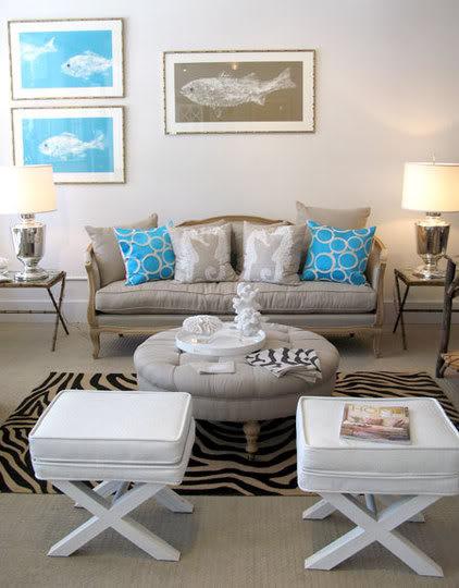Достаточно простая и чистая гостиная с бирюзовыми акцентами и оттенком гламура.